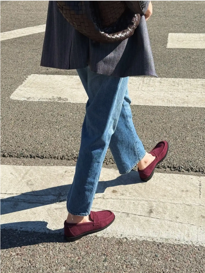 - Paired with denim and a beige sweater, burgundy shoes are the perfect finishing touch, showcasing a sense of richness within simplicity.